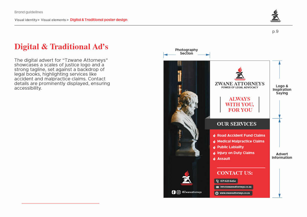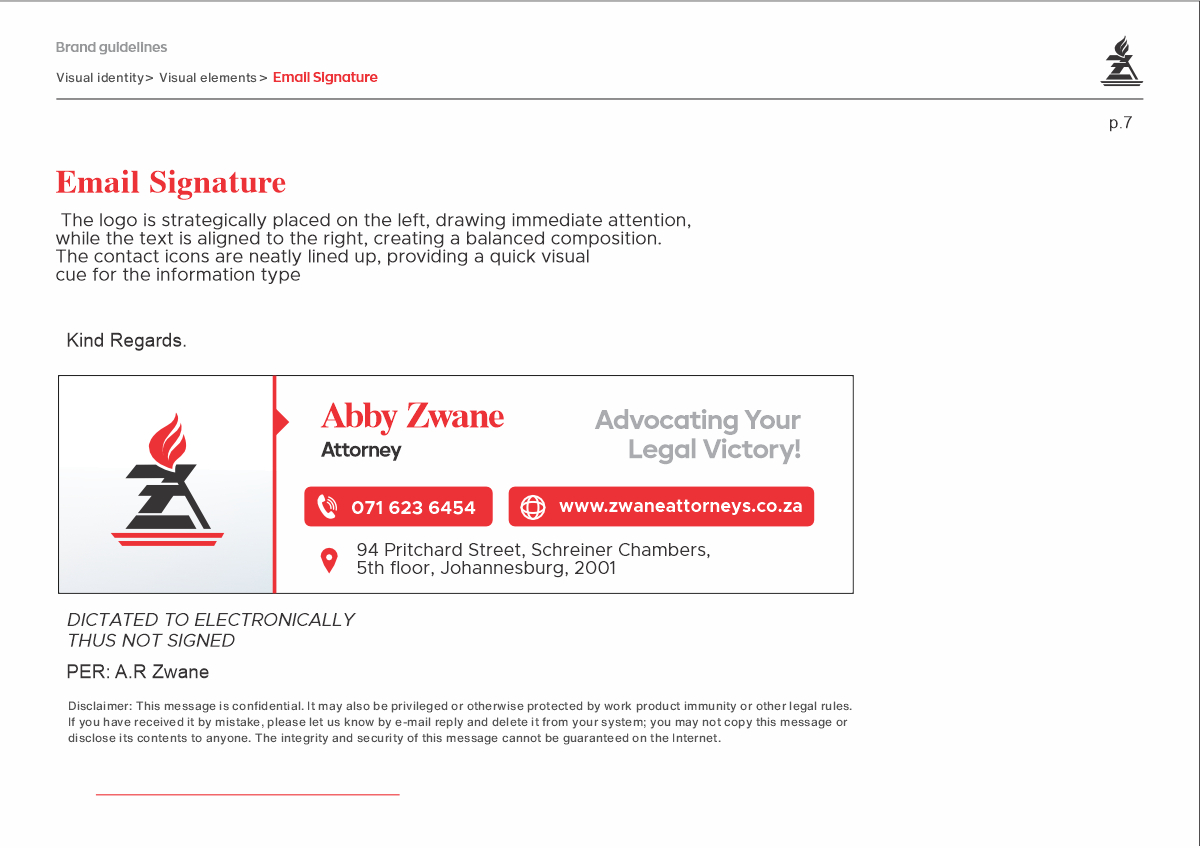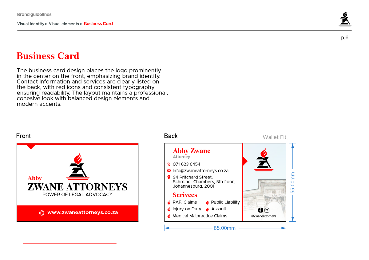 Zwane Attorneys engaged Ruan Designs to develop a comprehensive logo and startup identity manual. The project began with a discovery phase to understand Zwane Attorneys’ vision and values, ensuring the final design accurately reflected the firm’s identity. Additionally, a detailed company profile was created to highlight Zwane Attorneys’ expertise and services.