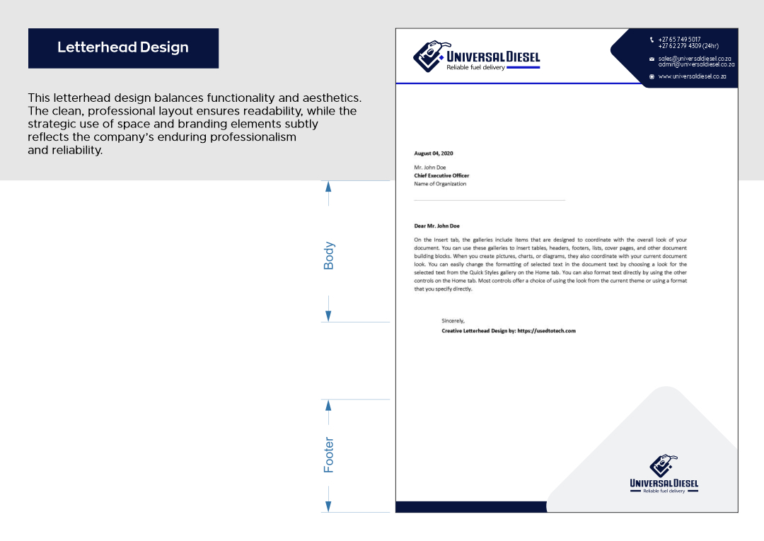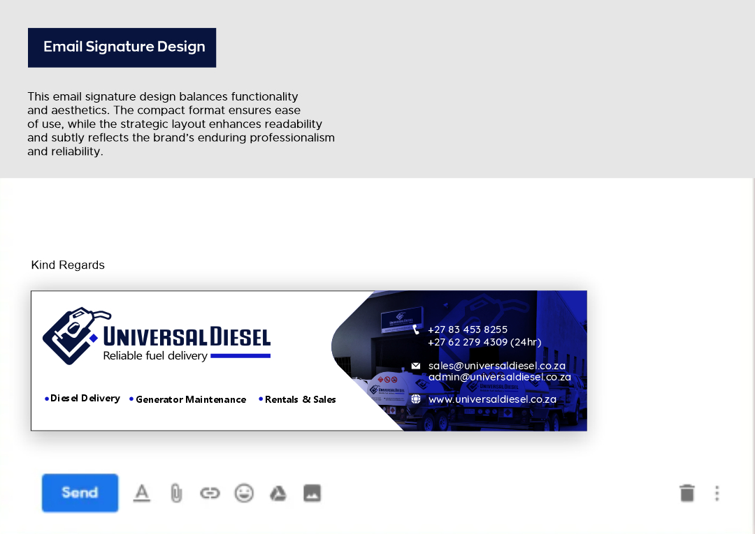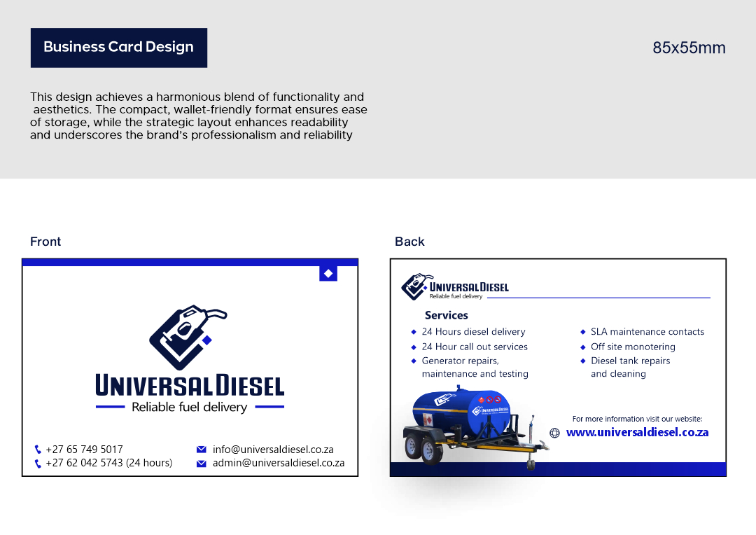 Universal Diesel partnered with Ruan Designs to create a cohesive brand identity. The project encompassed the design of a logo, business card, letterhead, email signature, and vehicle branding. This comprehensive approach ensured that Universal Diesel’s brand was consistently represented across all touchpoints.