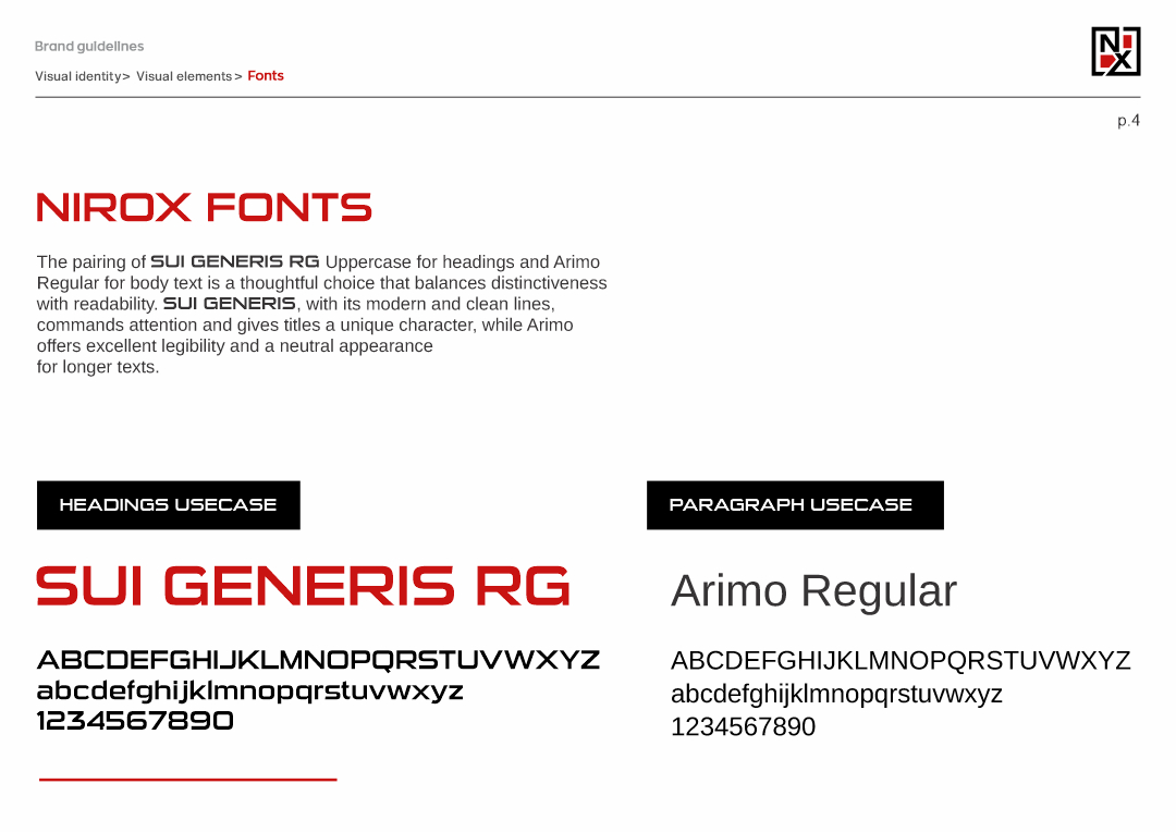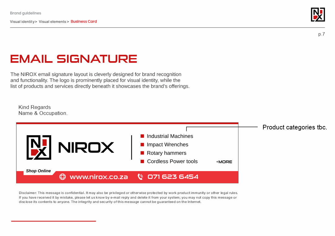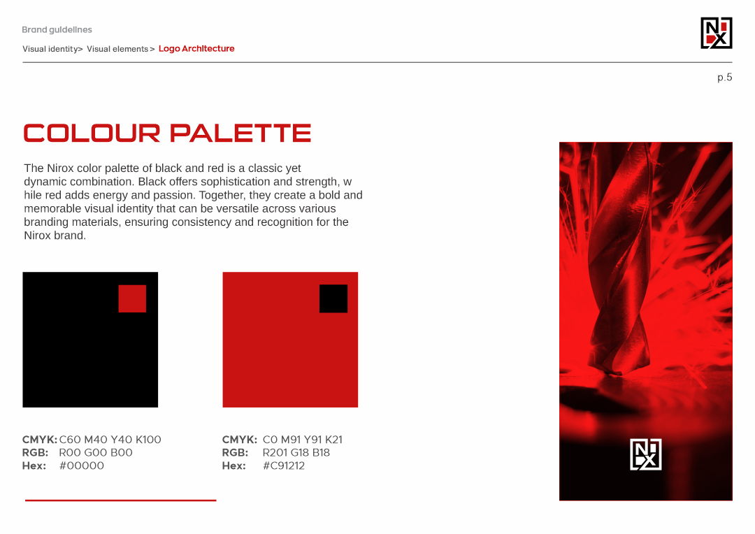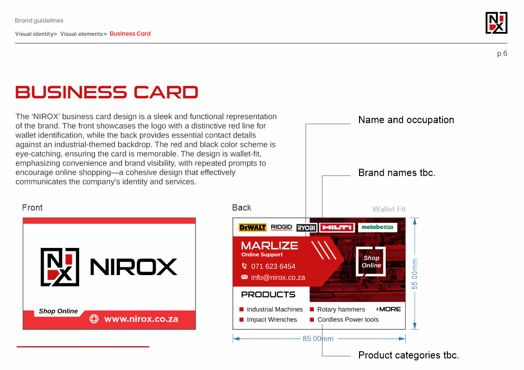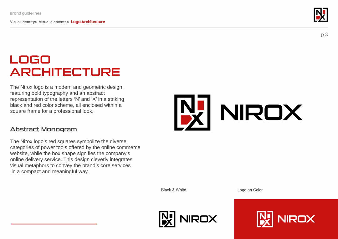 This project involved creating a cohesive brand identity for Nirox, an online tools retailer. The logo design incorporates elements of shipping and storage, using a square border to symbolize packaging. The monogram ‘NX’ is enhanced with red squares, representing the storage of tools available online.